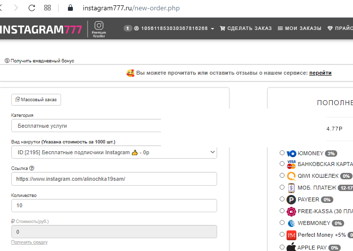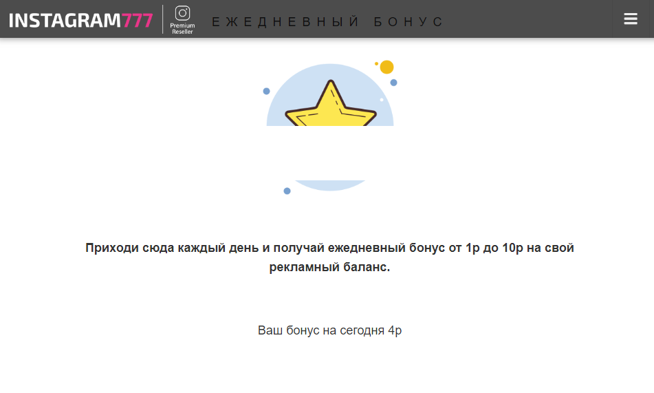 После регистрарации в Instagram777, жмешь сделать заказ ,забираешь ежедневный бонус до 10р(реально дают от 1 до 4 р).