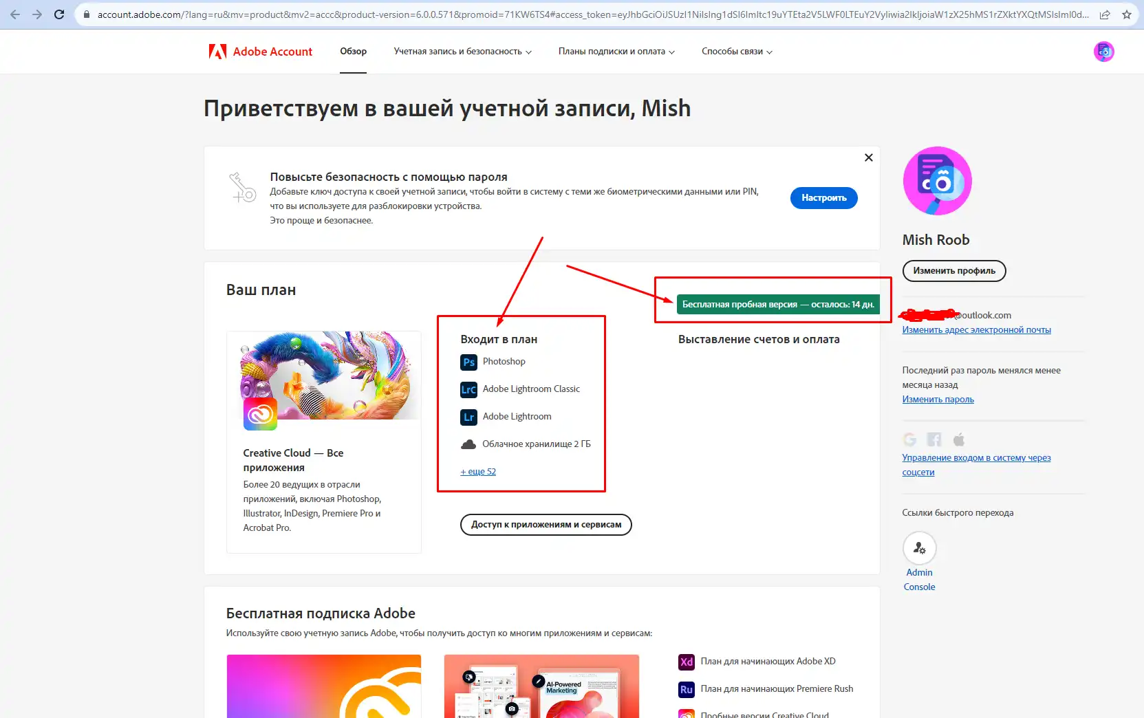 Для того, чтобы удостоверится, что пробный период активировался в правом верхнем углу в Adobe Creative Cloud нажимаем на аватарку - Учетная запись Adobe.